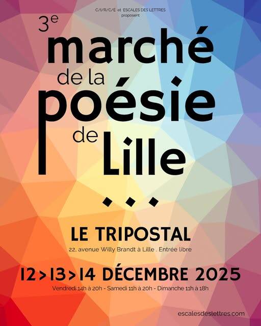 Je participerai au 3e Marché de la poésie de Lille qui aura lieu le vendredi 12 (de 14h à 20h), le samedi 13 (de 11h à 20h) et le dimanche 14 décembre (de 11h à 18h) à l'avenue Willy Brandt n° 22 (Lille). Durant ces 3 jours, je dédicacerai mon recueil de poèmes "La chevaucheuse de lune" (stand Chloé des Lys)